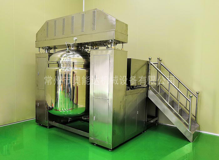 物料在水锅、油锅内通过加热、搅拌进行混合反应后,由真空泵吸入乳化锅,通过乳化锅内上部的中心搅拌、聚四氟乙烯刮板始终迎合搅拌锅形体,扫净挂壁粘料,使被刮取的物料不断产生新界面,再经过叶片的剪断、压缩、折叠,使其搅拌、混合而向下流往锅体下方的均质器处,物料再通过高速旋转的切割轮与固定的切割套之间所产生的强力的剪断、冲击、乱流等过程,物料在剪切缝中被切割,迅速破碎成200um-0.2um的微粒,由于乳化锅内处于真空状态,物料在搅拌过程中产生的气泡被及时抽走。采用抽真空的方式,使所生产的制品在搅拌过程中不再混入气泡,从而保证可制造出富有光泽、细腻及延展性良好的产品。